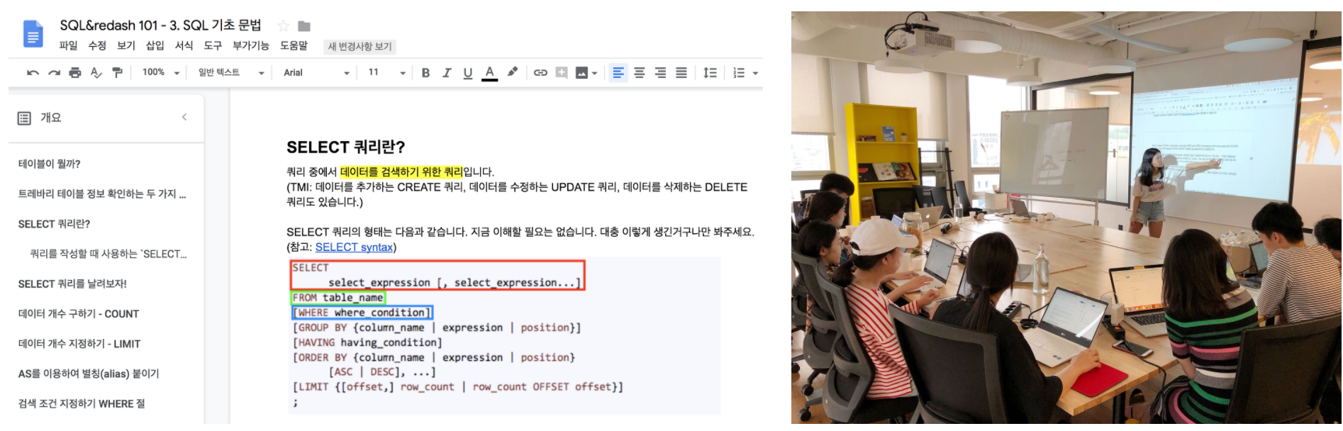 데이터 환경 설정과 SQL 기초 문법에 대한 학습 자료를 작성하고 두 차례의 사내 세미나를 진행했다. 가능한 트레바리 내부 데이터를 활용하는 예제를 넣어 최대한 실무와 맞닿을 수 있도록 신경 썼다.