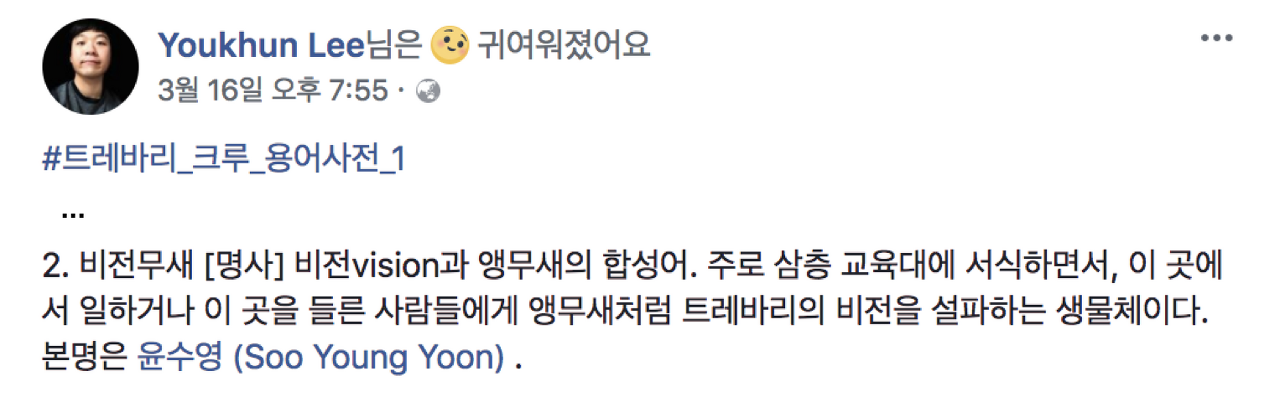 다른 이유가 하나 더 있다면 이는 트레바리에서 일하는 것이 어떨지 궁금해하는 사람들을 위함이다. 이 글을 보며 함께 일할 창업가가 어떤 사람인지 슬쩍 엿볼 수 있으면 좋겠다. 창업가가 어떤 사람이냐에 따라 그 회사의 분위기가 좌우된다고 생각한다.